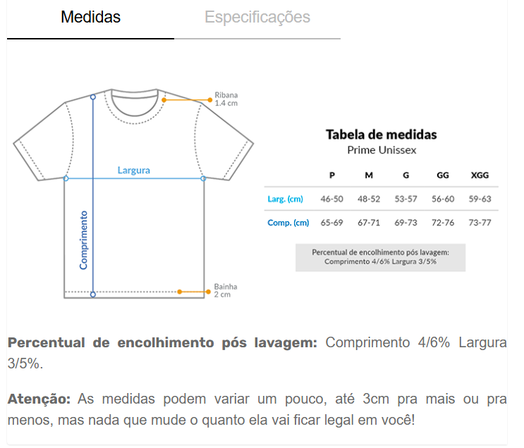 Cores do produto: Como cada tela de computador ou celular tem seu próprio jeito de mostrar cores, então a cor da sua camiseta e da estampa pode ser um pouco diferente do que você viu online.